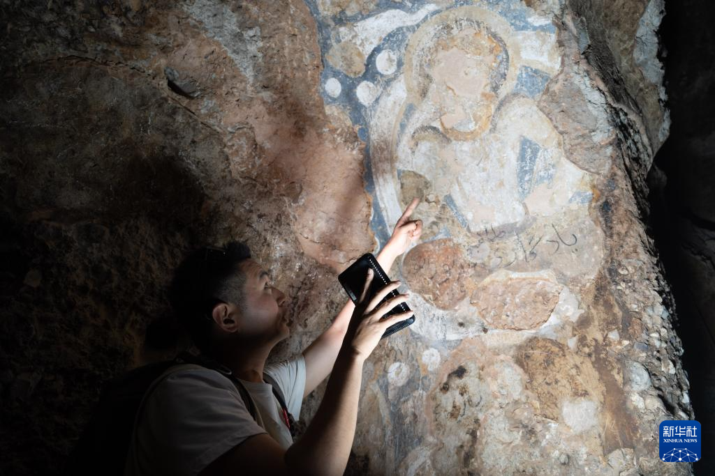 6月15日,在阿富汗巴米揚省,中國學者邵學成在一處石窟中觀察壁畫。新華社記者 趙家淞 攝