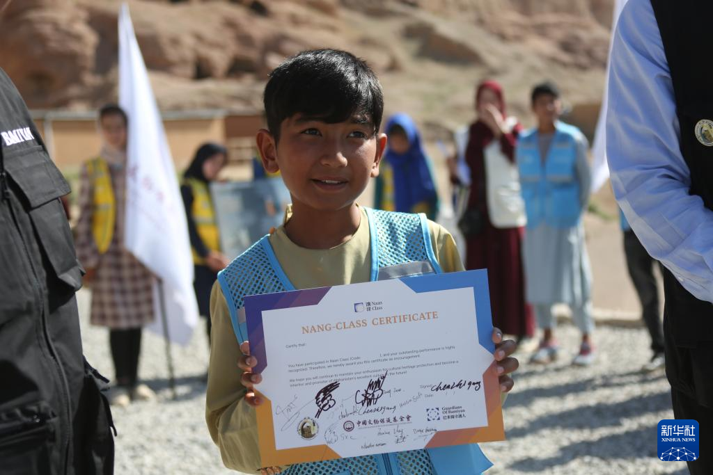 6月16日,在阿富汗巴米揚省的巴米揚大佛遺址區(qū),參加“馕課”的當?shù)貙W生穆罕默德·扎伊德展示榮譽證書。新華社發(fā)(塞夫拉赫曼·薩菲攝)