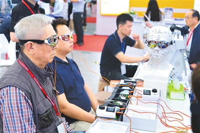 圖為近日,觀眾在第十屆中國(guó)國(guó)際養(yǎng)老服務(wù)業(yè)博覽會(huì)上體驗(yàn)“多效經(jīng)穴激活治療儀”。