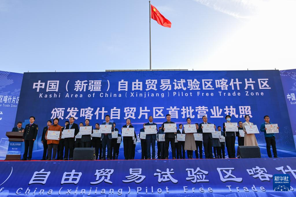 2023年11月11日,在中國(新疆)自由貿(mào)易試驗(yàn)區(qū)喀什片區(qū)揭牌儀式現(xiàn)場,首批入駐自貿(mào)片區(qū)的經(jīng)營主體獲頒營業(yè)執(zhí)照。新華社記者 丁磊 攝