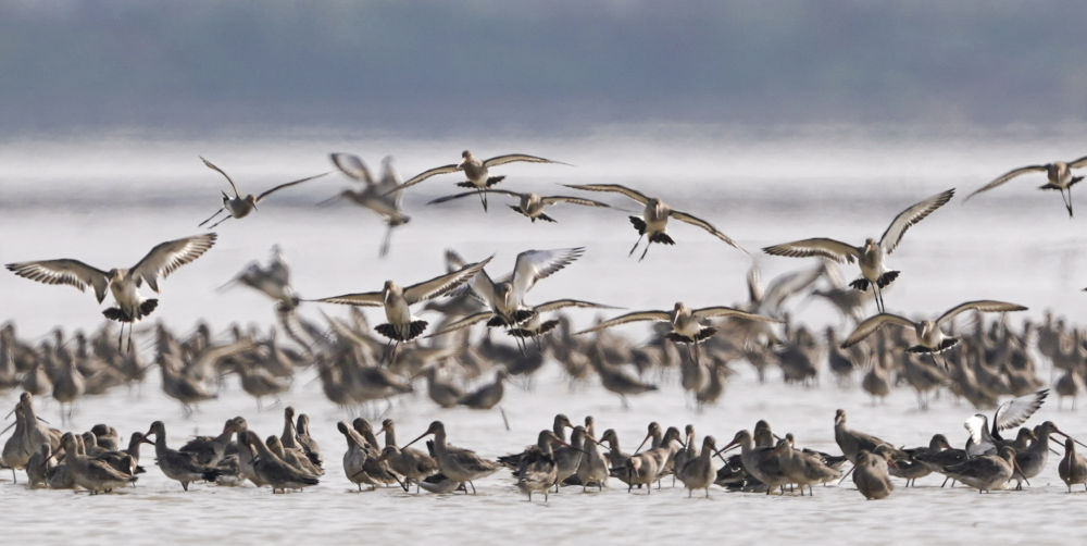 在江西省南昌市,一群黑尾塍鷸在鄱陽(yáng)湖畔的五星白鶴保護(hù)小區(qū)上空飛翔(2023年3月10日攝)。新華社記者 周密 攝