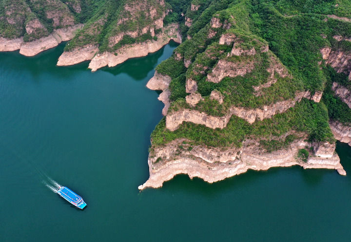 這是在河南省濟(jì)源市拍攝的黃河三峽景色(2024年5月28日攝,無(wú)人機(jī)照片)。新華社記者 李安 攝