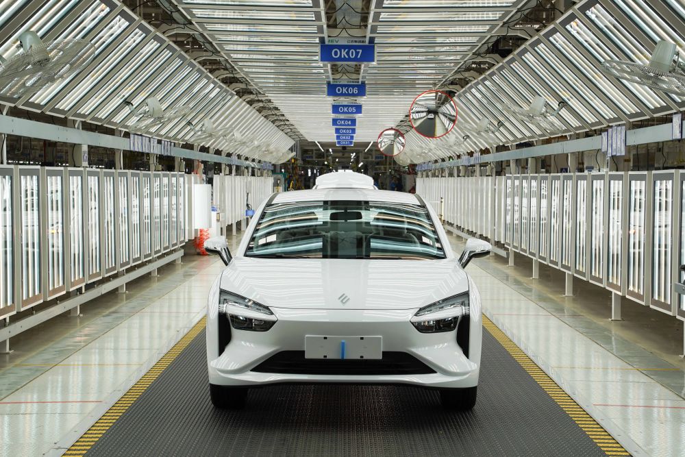 在位于江西省南昌市經(jīng)開(kāi)區(qū)的江鈴集團(tuán)新能源汽車(chē)有限公司生產(chǎn)基地拍攝的汽車(chē)生產(chǎn)流水線(2023年7月18日攝)。新華社記者 周密 攝