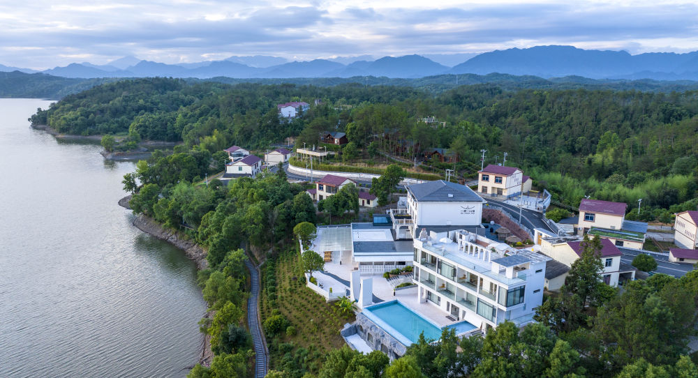 這是江西省武寧縣修河畔“一渡一山?!泵袼奕?,一些返鄉(xiāng)農(nóng)民在這里受聘為民宿管家(2024年6月3日攝,無(wú)人機(jī)照片)。新華社發(fā)(梁振堂 攝)