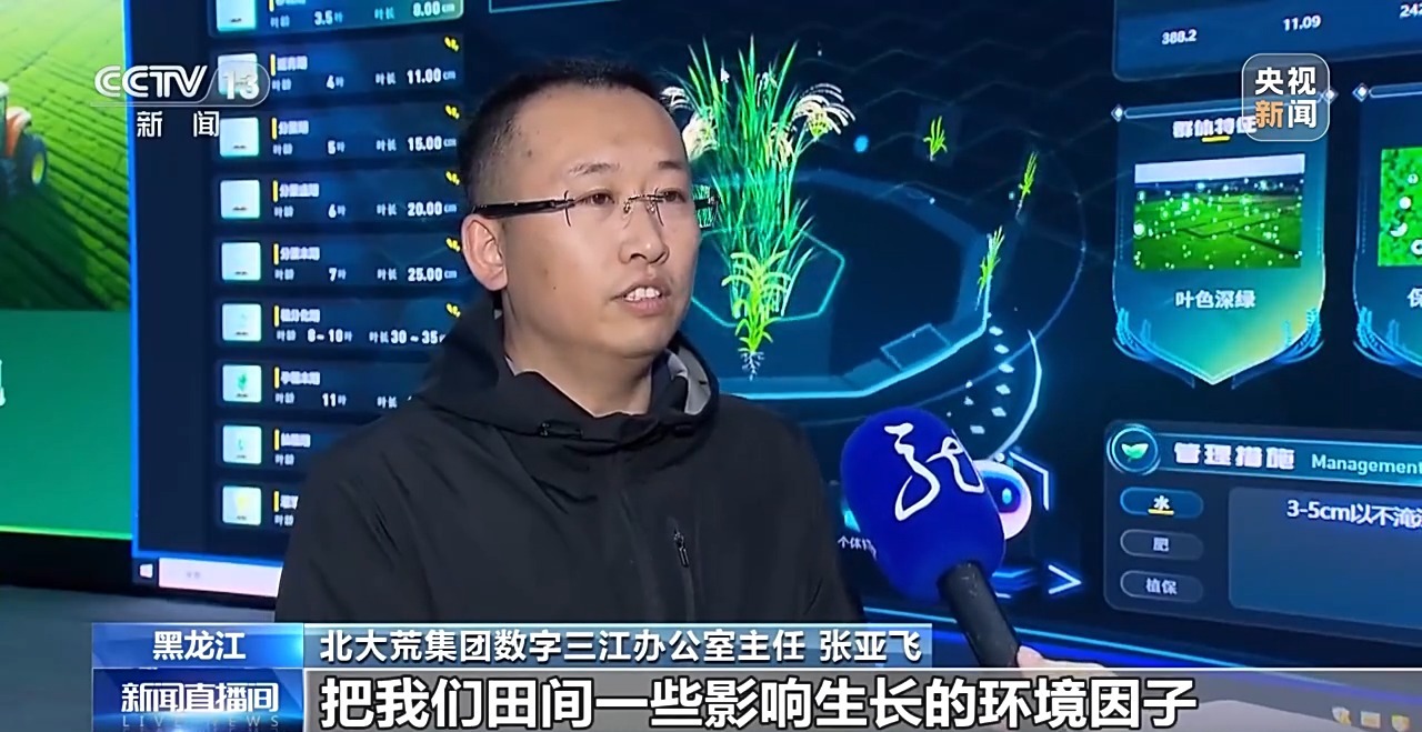北大荒集團(tuán)數(shù)字三江辦公室主任 張亞飛:通過(guò)無(wú)人機(jī)群把我們田間的一些影響生長(zhǎng)的環(huán)境因子采集回來(lái),然后輸入到我們的大模型之內(nèi),采取的手段是空、天、地、人機(jī)一體化的感知手段,形成當(dāng)時(shí)、當(dāng)季需要進(jìn)行的農(nóng)事活動(dòng)的決策指令,通過(guò)這個(gè)數(shù)字生產(chǎn)模型來(lái)指導(dǎo)我們的種植戶(hù)更加科學(xué)地進(jìn)行種植,提高水稻單產(chǎn)。