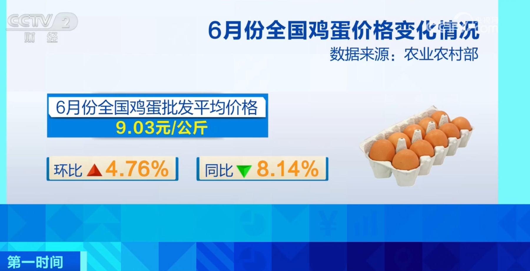 據(jù)農(nóng)業(yè)農(nóng)村部監(jiān)測,6月份全國雞蛋批發(fā)平均價格為每公斤9.03元,環(huán)比上漲4.76%,同比下降8.14%。