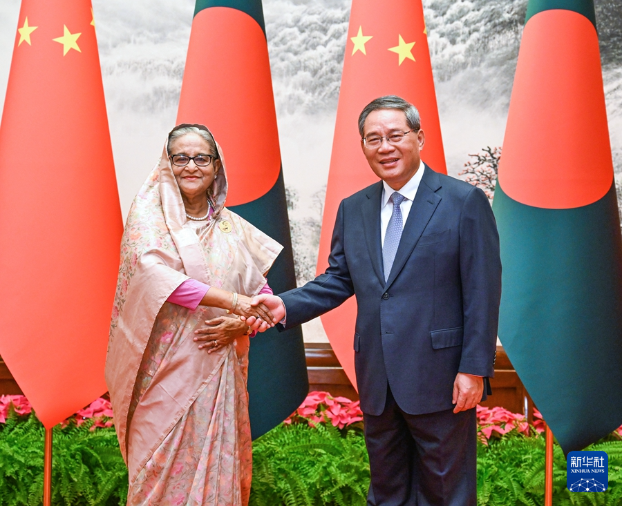 7月10日上午,國務(wù)院總理李強在北京人民大會堂同來華進行正式訪問的孟加拉國總理哈西娜舉行會談。新華社記者 饒愛民 攝