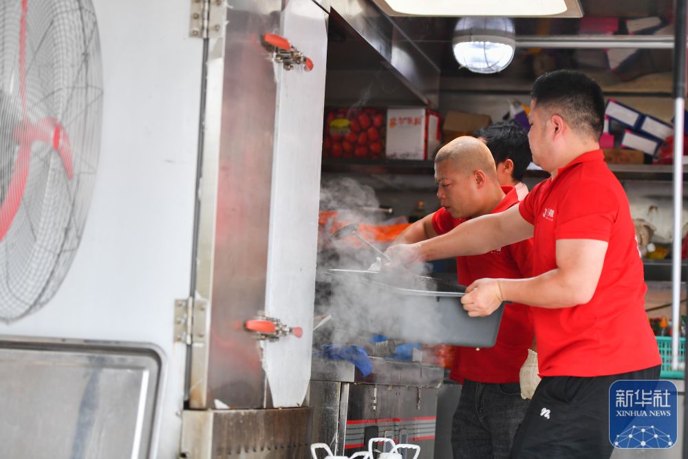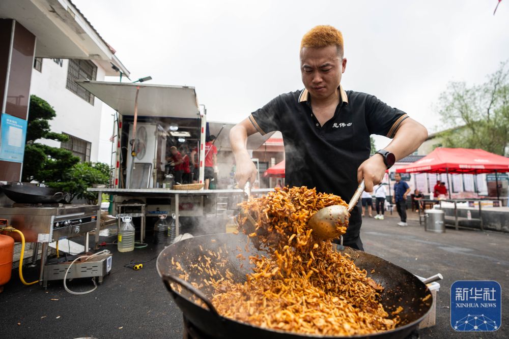 7月8日,在岳陽(yáng)市良心堡鎮(zhèn)望君洲村,志愿者在炒制菜肴。新華社記者 陳思汗 攝
