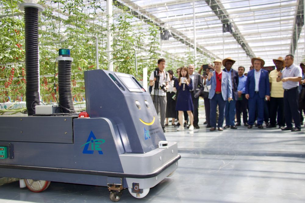 7月12日,駐華使節(jié)走訪鄂爾多斯市達拉特旗德農現(xiàn)代高效設施農業(yè)產業(yè)園,觀看巡檢機器人工作。新華社記者 劉嵐?jié)?攝
