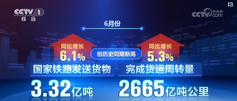 記者7月14日從國鐵集團獲悉,6月份,國家鐵路發(fā)送貨物3.32億噸,完成貨運周轉量2665億噸公里,同比分別增長6.1%、5.3%,創(chuàng)歷史同期新高。