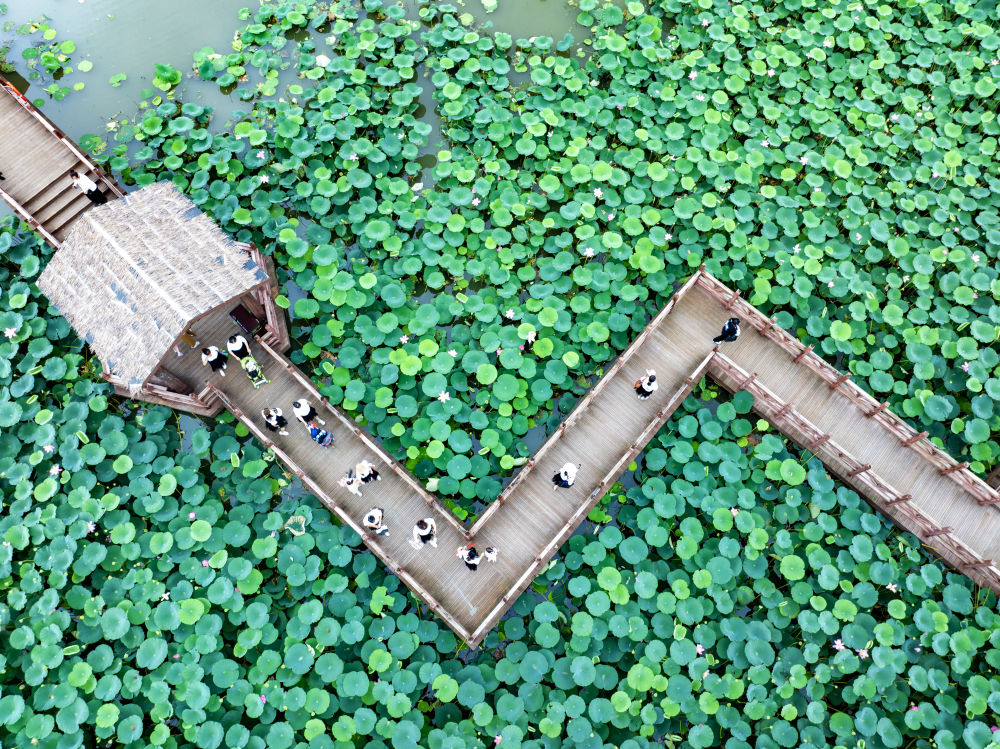 7月14日,游人在江蘇興化里下河國(guó)家濕地公園游玩(無人機(jī)照片)。新華社發(fā)(周社根攝)