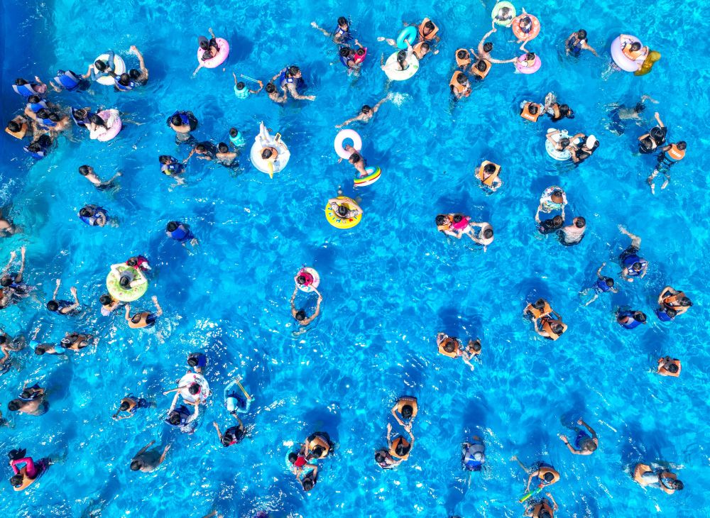 7月14日,人們?cè)谥貞c市酉陽(yáng)土家族苗族自治縣一水上樂園游玩戲水(無人機(jī)照片)。新華社發(fā)(邱洪斌攝)