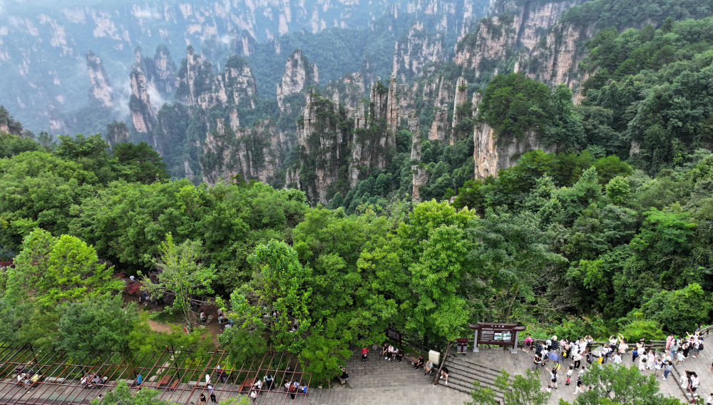 7月14日,游客在張家界國(guó)家森林公園天子山游覽(無人機(jī)照片)。新華社發(fā)(吳勇兵攝)