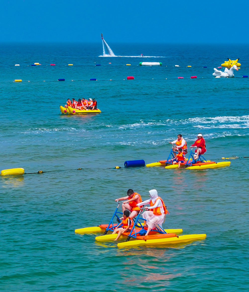 7月13日,游客在山東省榮成市那香海海水浴場(chǎng)體驗(yàn)水上娛樂項(xiàng)目(無人機(jī)照片)。新華社發(fā)(李信君攝)