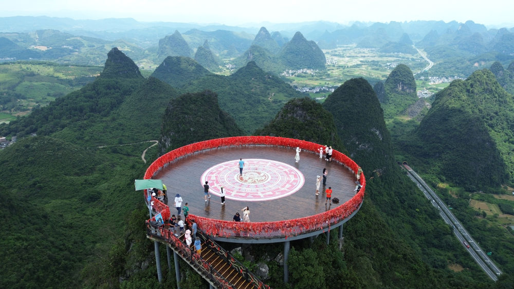 7月13日,游客在廣西桂林市陽(yáng)朔縣如意峰觀景(無人機(jī)照片)。新華社發(fā)(廖祖平攝)