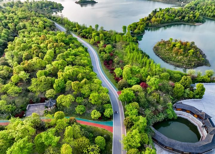 這是2022年4月5日拍攝的江西省萍鄉(xiāng)市萍水湖濕地公園(無人機(jī)照片)。萍鄉(xiāng)市將治水與綠化相結(jié)合,沿萍水河打造萍水湖濕地公園。新華社發(fā)(李桂東 攝)