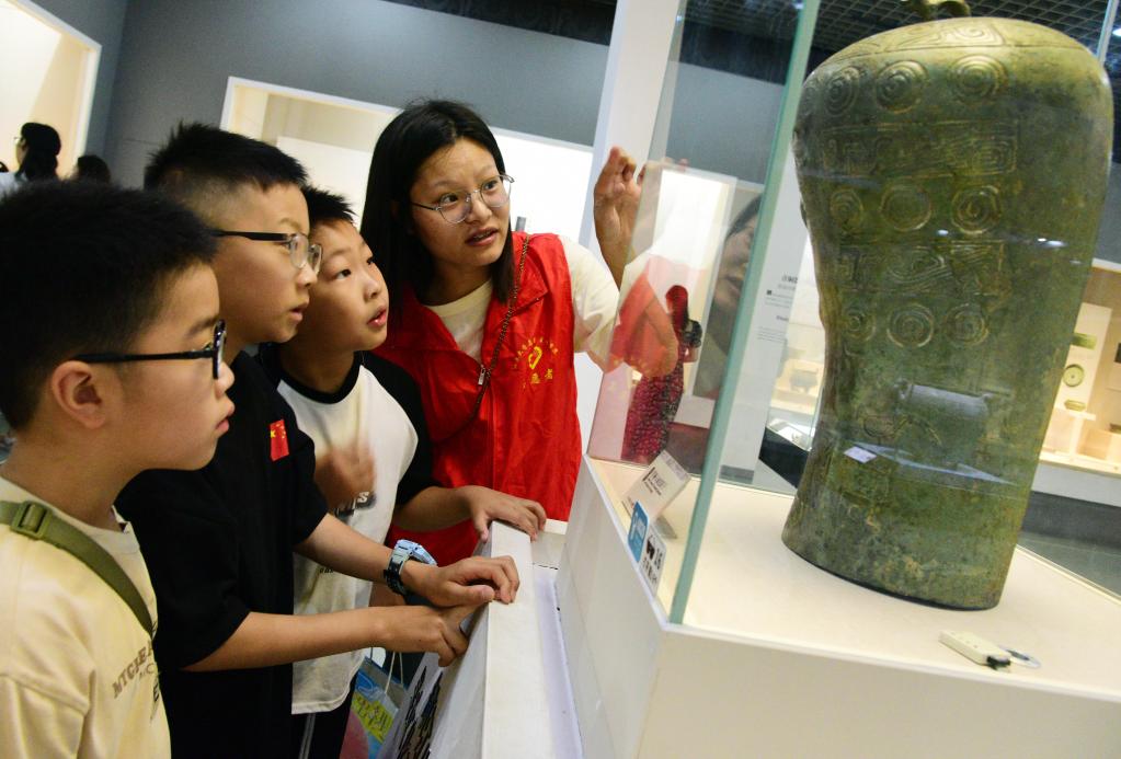 7月14日,在江蘇省鎮(zhèn)江博物館,江蘇大學(xué)志愿者為小朋友介紹文物。新華社發(fā)(石玉成 攝)