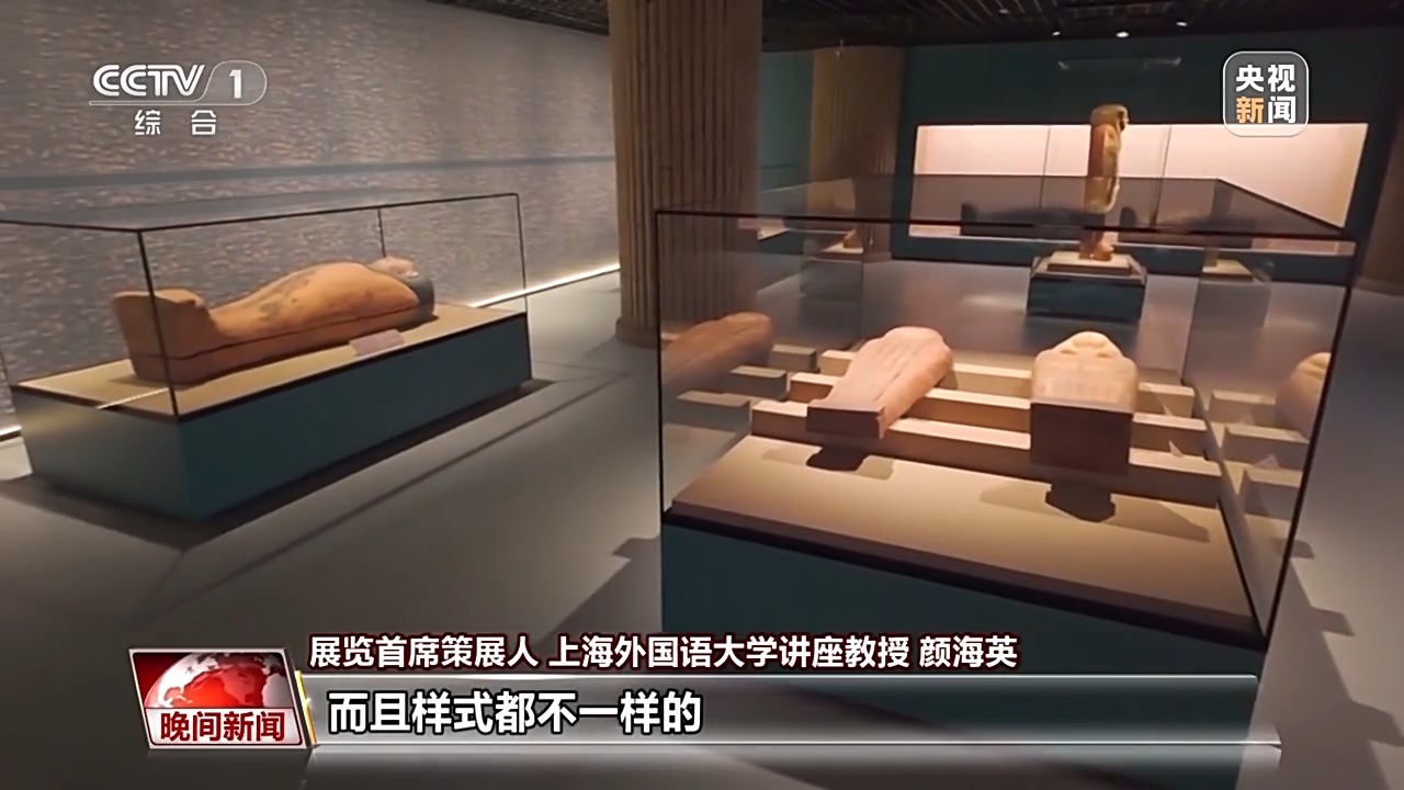 展覽首席策展人、上海外國語大學講座教授 顏海英:選了10個最精美的,而且樣式都不一樣的彩繪人形棺,其中最大的一個特點就是它的臉涂成不同的顏色,現在展廳里面立著一個綠臉的棺,然后還有紅臉的、黑臉的,那它具體是什么不同的象征含義,現在我們還沒有解讀,這是未來將要研究的問題。