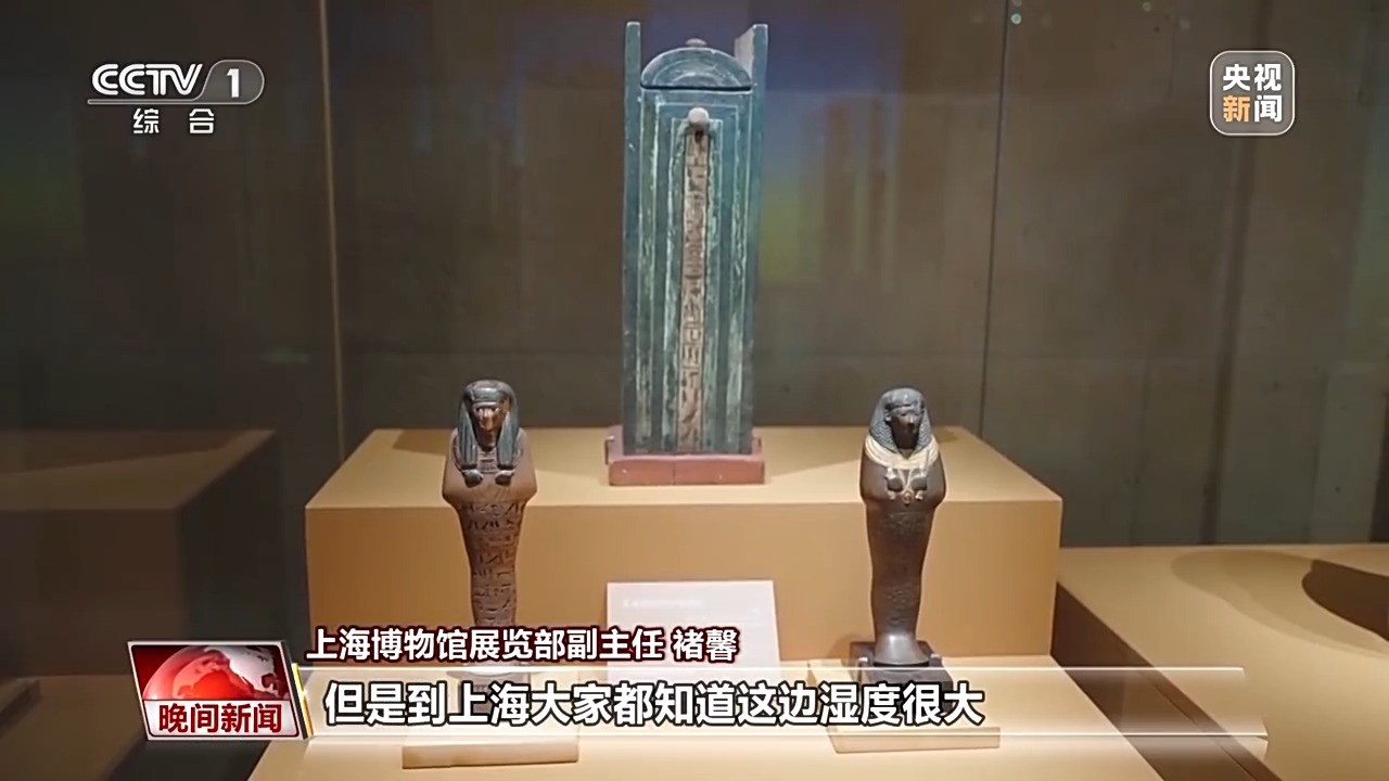 上海博物館展覽部副主任 褚馨:埃及的天氣比較干燥,它保存得特別好,但是到上海大家都知道這邊濕度很大,我們對它還進行了脫蟲的處理,全部處理好了以后,才放到恒溫恒濕的展柜當中。