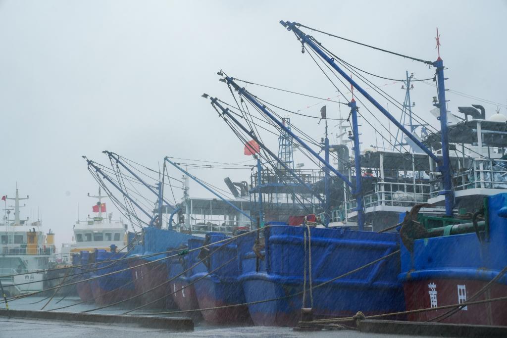 7月25日下午,在位于福建省莆田市秀嶼區(qū)埭頭鎮(zhèn)的石城國家一級(jí)漁港,今年第3號(hào)臺(tái)風(fēng)“格美”的外圍風(fēng)圈已經(jīng)襲來。七八級(jí)的陣風(fēng)夾雜著豆大的雨點(diǎn)打在臉上,裹挾著三四米高的海浪拍擊著護(hù)堤,激起白茫茫一片水花。漁港里,100多艘大小船舶已在24日中午12點(diǎn)前回港,呈“半月環(huán)抱”狀整齊停泊,船舶間已用纜繩加固。