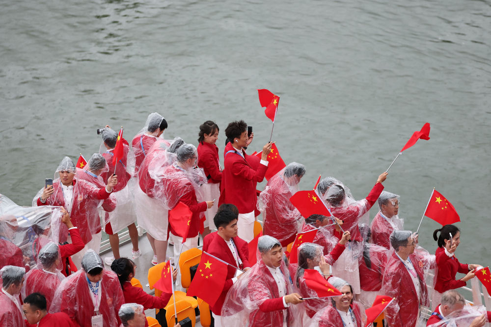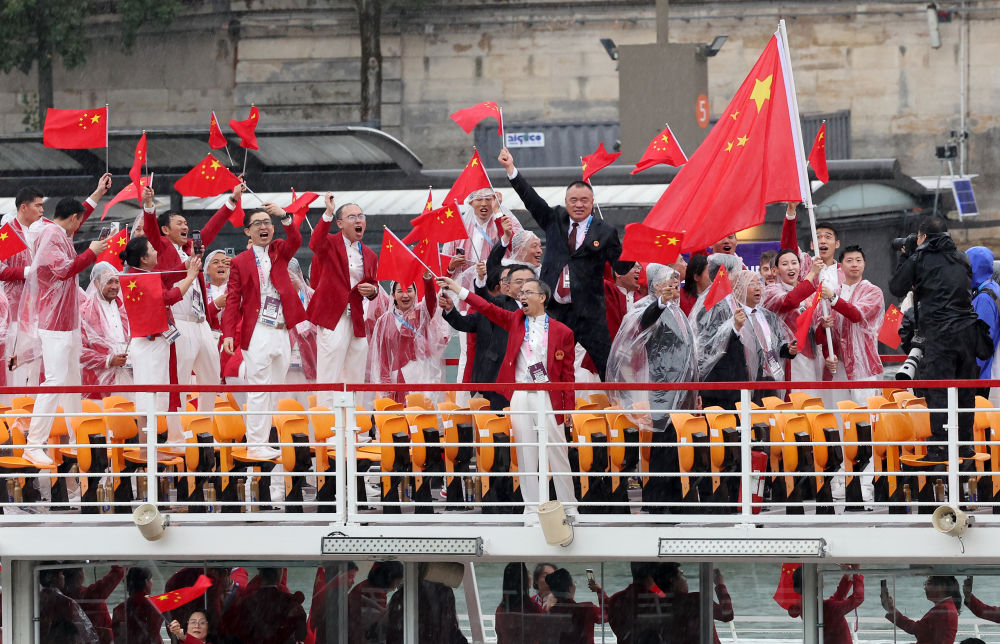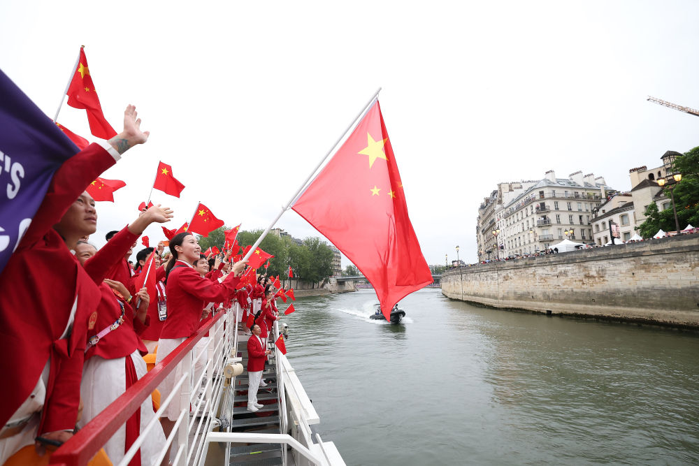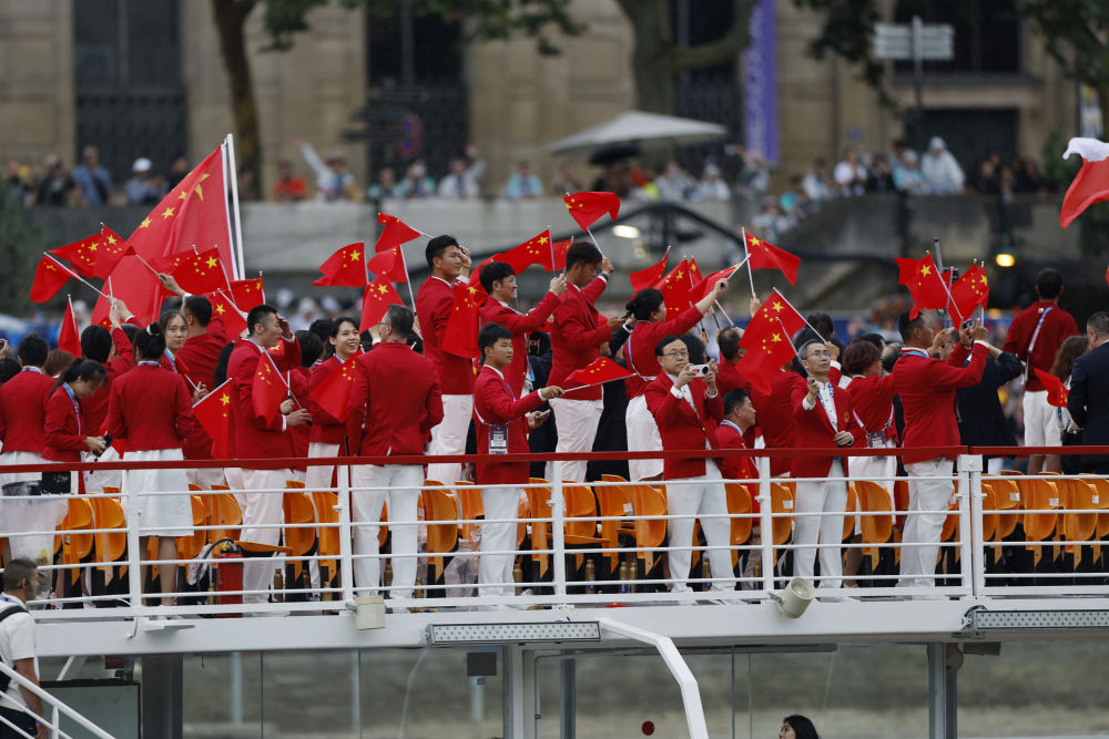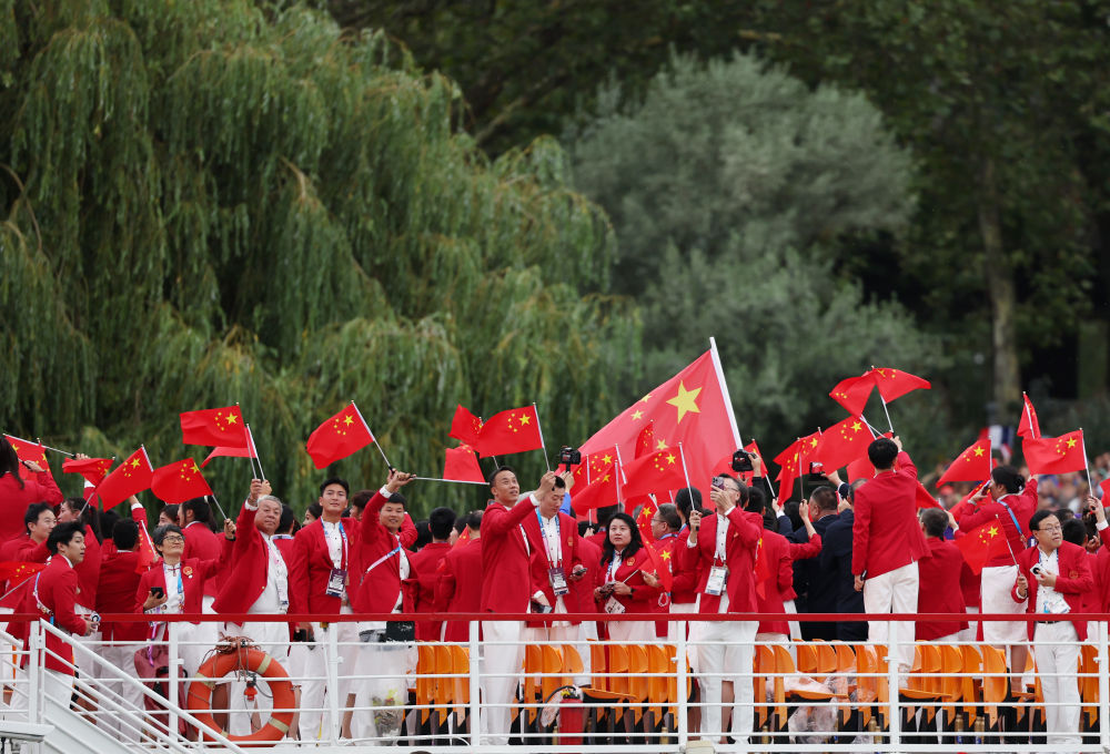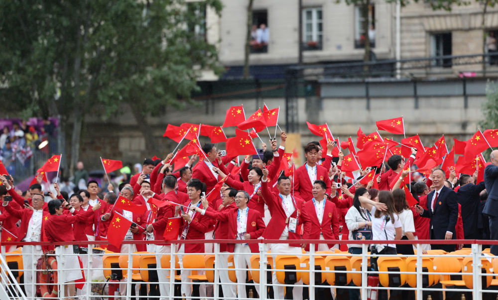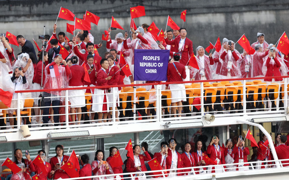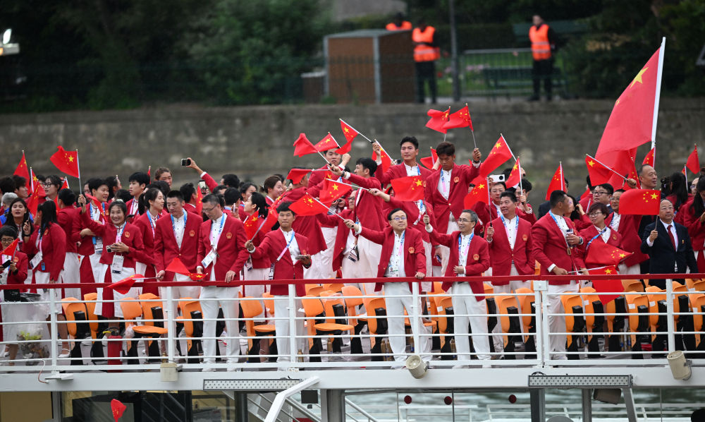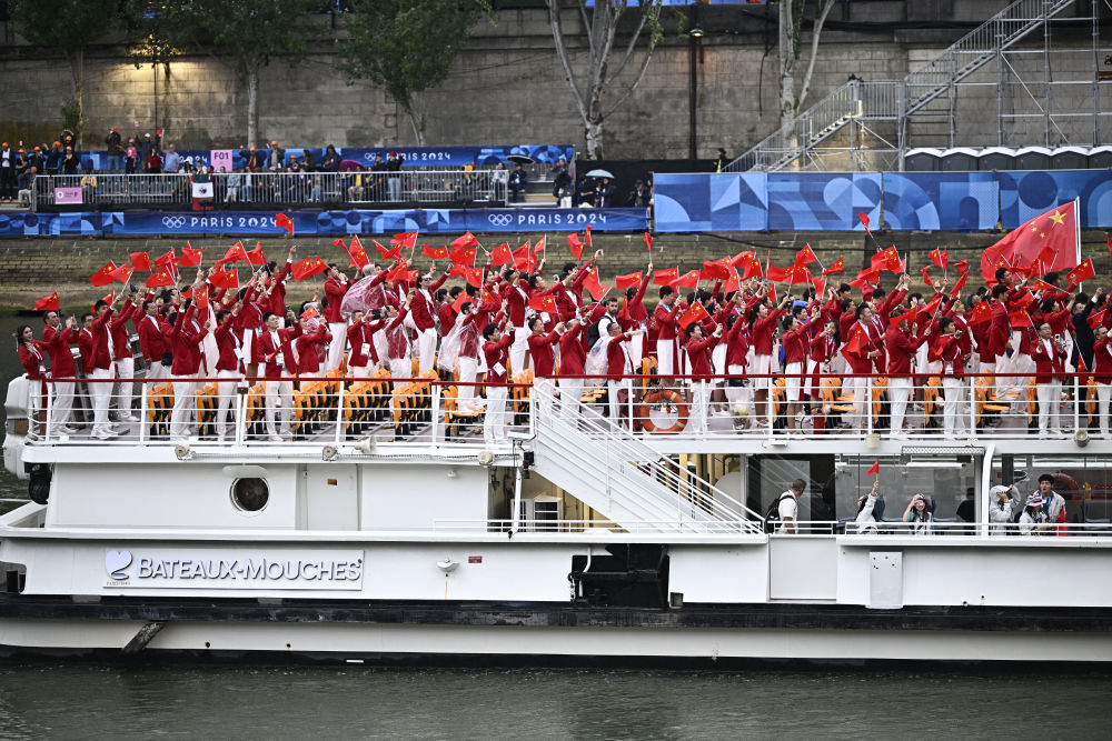 當(dāng)?shù)貢r(shí)間7月26日,第33屆夏季奧林匹克運(yùn)動(dòng)會(huì)開幕式在法國(guó)巴黎舉行。乒乓球運(yùn)動(dòng)員馬龍、花樣游泳運(yùn)動(dòng)員馮雨高擎五星紅旗,中國(guó)體育代表團(tuán)運(yùn)動(dòng)員乘船在塞納河巡游。