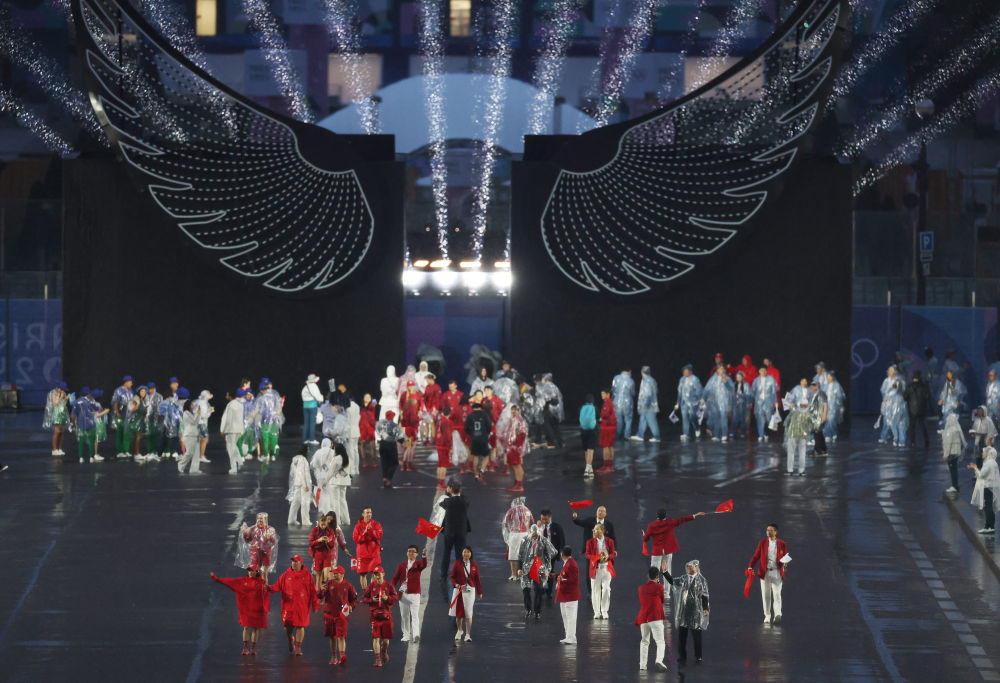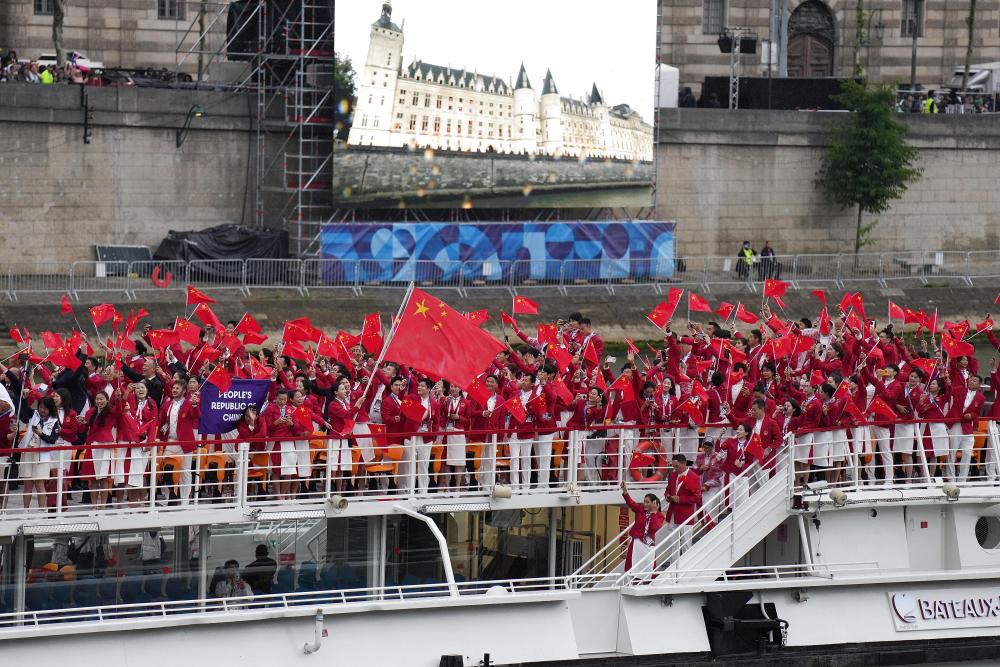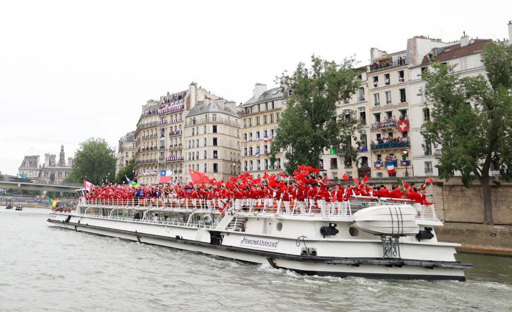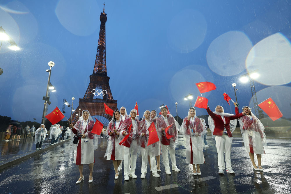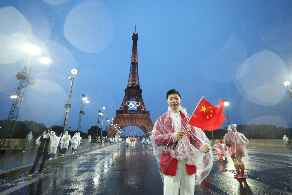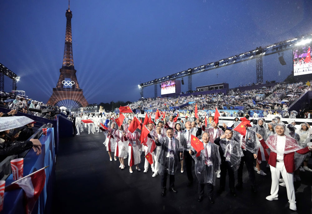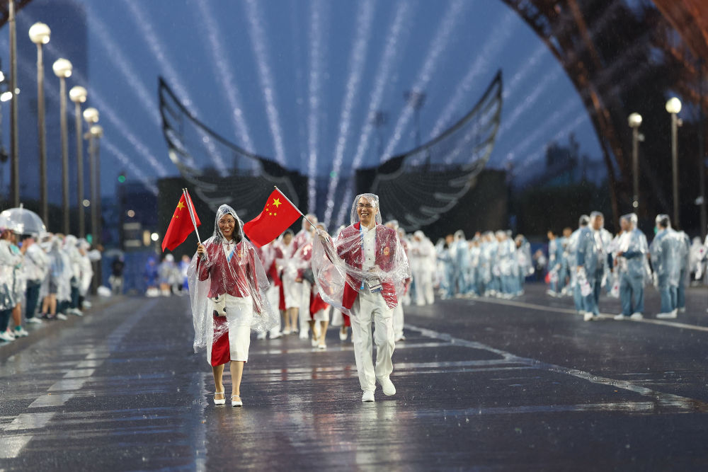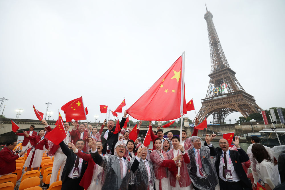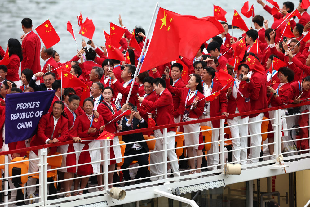 當(dāng)?shù)貢r(shí)間7月26日,第33屆夏季奧林匹克運(yùn)動(dòng)會(huì)開幕式在法國(guó)巴黎舉行。乒乓球運(yùn)動(dòng)員馬龍、花樣游泳運(yùn)動(dòng)員馮雨高擎五星紅旗,中國(guó)體育代表團(tuán)運(yùn)動(dòng)員乘船在塞納河巡游。