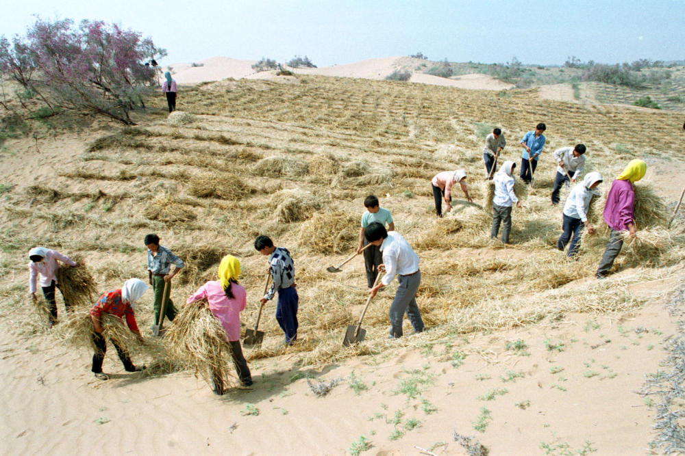 寧夏中衛(wèi)固沙林場(chǎng)職工在扎麥草方格(1994年9月24日攝)。新華社記者 劉海峰 攝