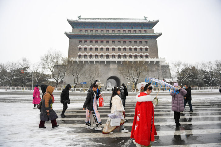 游客行走在雪后的正陽(yáng)門(mén)箭樓前(2023年12月14日攝)。