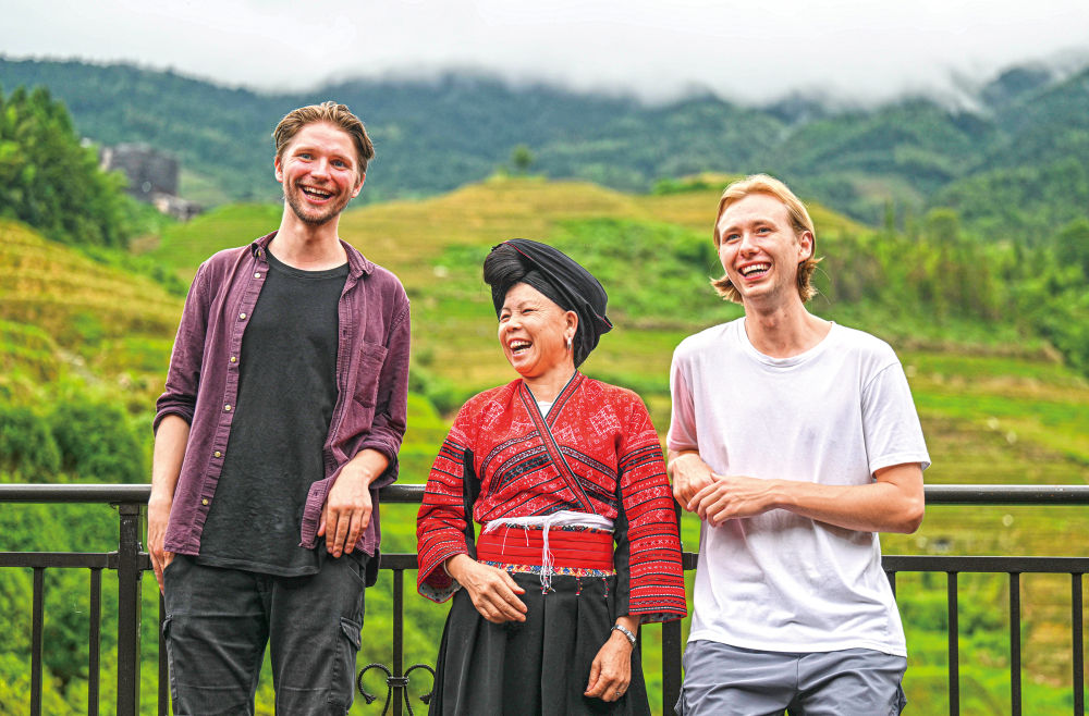 廣西桂林市龍勝各族自治縣龍脊鎮(zhèn)大寨村村民潘鳳蘭(中)在她家民宿外和兩位德國游客交流(六月二十六日攝)。新華社記者趙子碩攝