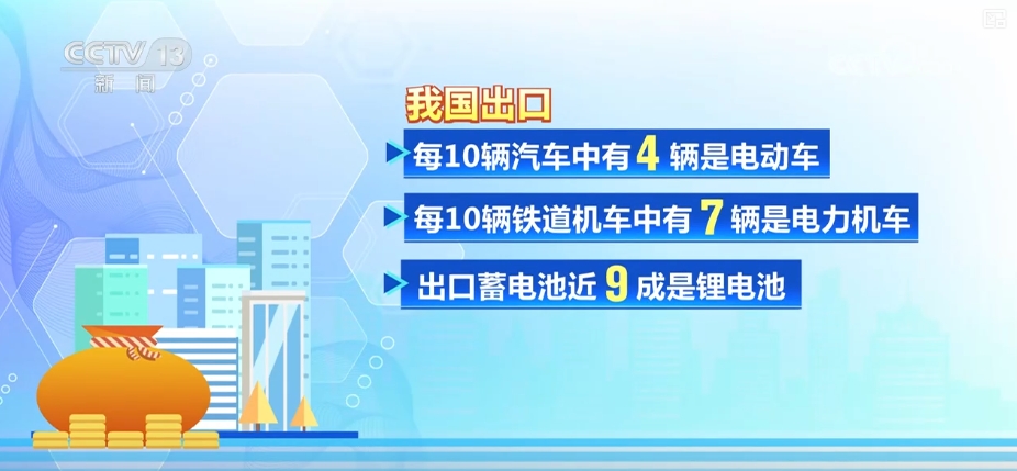 據(jù)海關統(tǒng)計,我國出口的每10輛汽車中有4輛是電動車,每10輛鐵道機車中有7輛是電力機車,出口蓄電池近九成是鋰電池,外貿(mào)出口的綠色屬性更強。