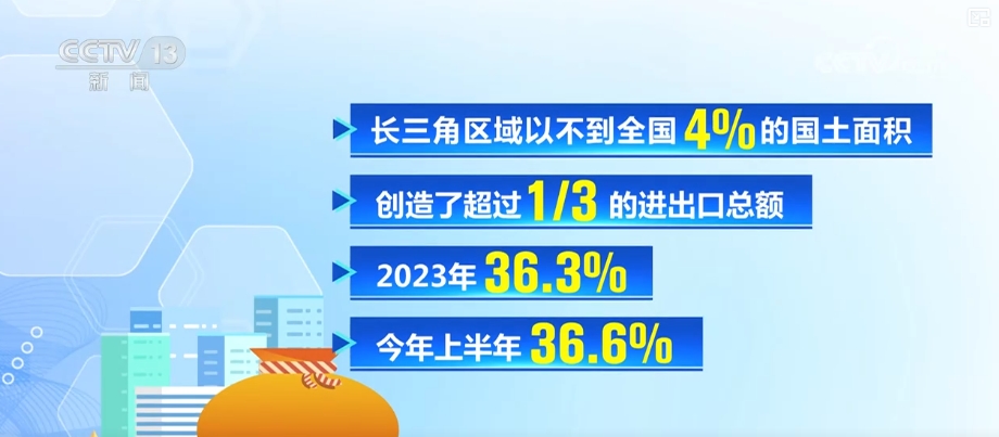 長三角區(qū)域以不到全國4%的國土面積,創(chuàng)造了超過三分之一的進出口總額,2023年36.3%,2024年上半年36.6%。