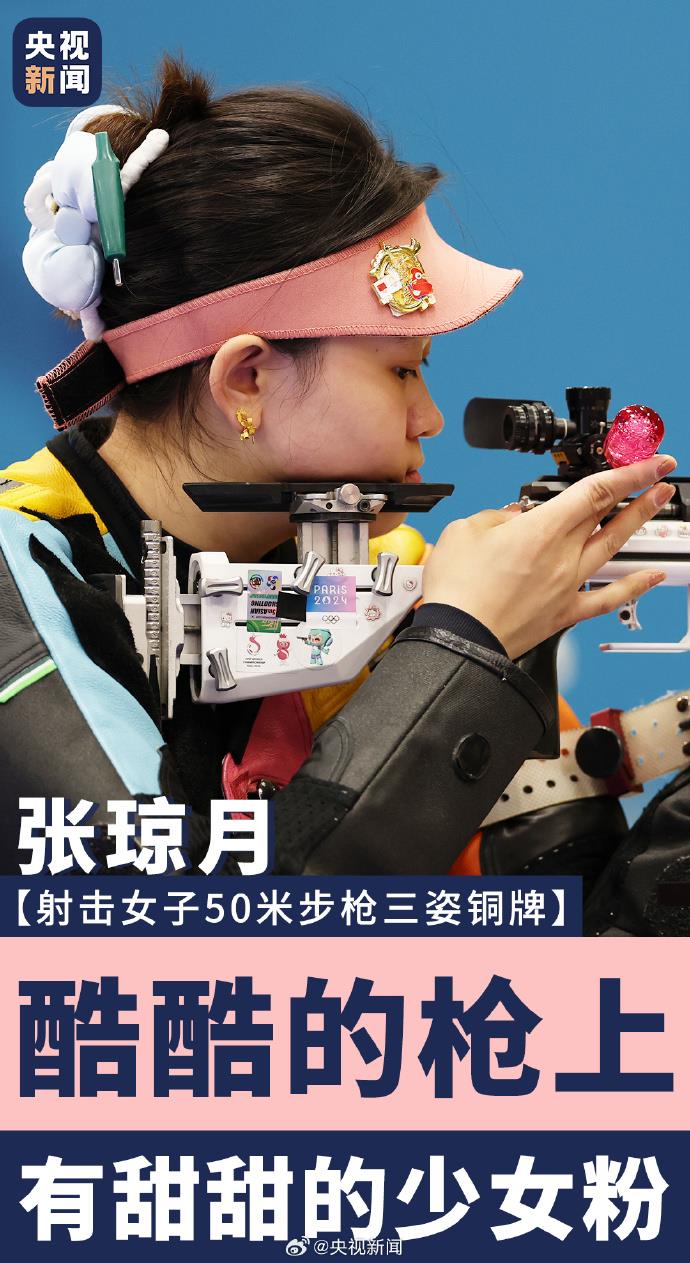 8月2日,在巴黎奧運(yùn)會射擊女子50米步槍三姿決賽中,中國選手張瓊月奪得銅牌。戴著粉色帽子的張瓊月,步槍上貼滿可愛的Hello Kitty貼紙,用最萌的裝備打最穩(wěn)的槍!
