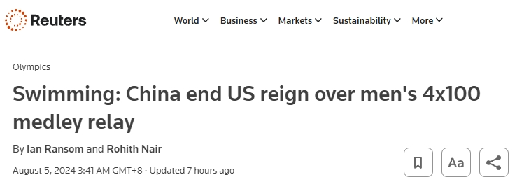 當?shù)貢r間8月4日,在游泳男子4×100米混合泳接力中,中國隊反超該項目的奧運“霸主”美國隊以及東道主法國隊,以3分27秒46奪冠。英國路透社(Reuters)4日的報道中寫道,現(xiàn)場歡呼聲震耳欲聾,中國隊的奪冠結束了美國隊64年來的不敗紀錄。賽后,美國選手萊恩·墨菲(Ryan Murphy)說:“今天中國隊的表現(xiàn)比我們要更好一些,向中國隊致敬,他們今晚的表現(xiàn)非常出色?!绷硪幻绹x手亨特·阿姆斯特朗(Hunter Armstrong)則關注到當天是中國選手潘展樂的生日,他表示:“這對他來說會是一份很酷的生日禮物!”