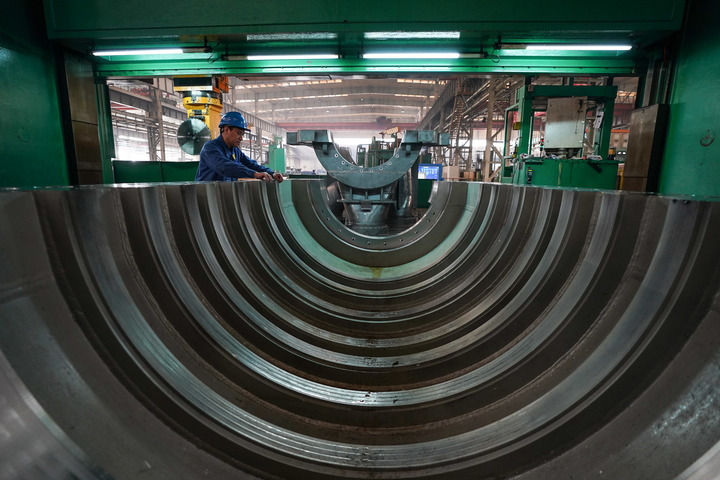 工人在位于黑龍江省齊齊哈爾市的中國一重集團有限公司生產(chǎn)車間運送產(chǎn)品(2024年3月5日攝)。