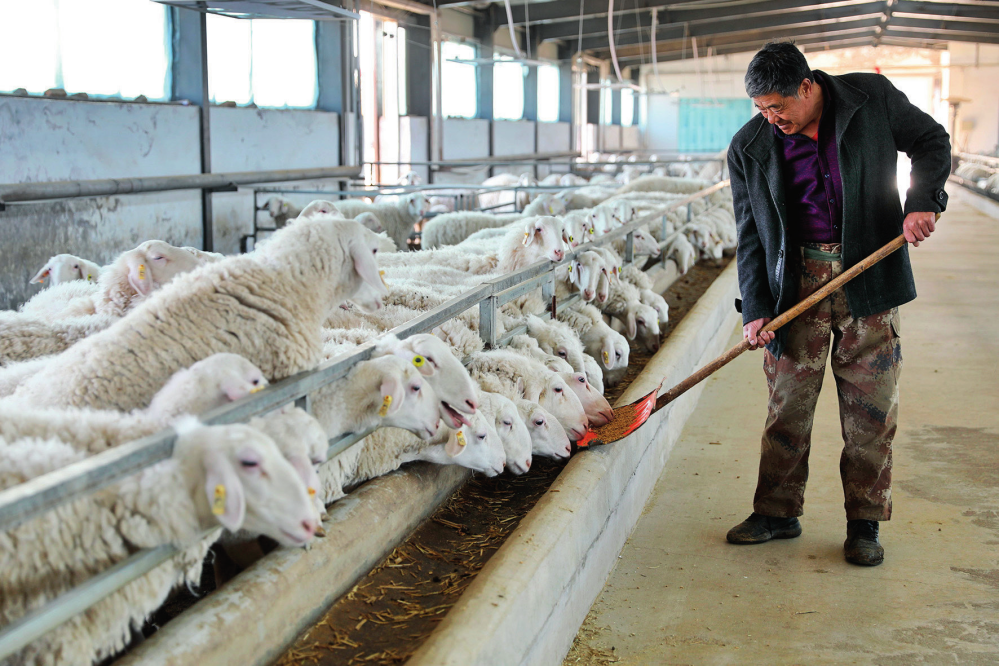 山西省朔州市右玉縣張千戶(hù)嶺養(yǎng)殖專(zhuān)業(yè)合作社的工作人員王吉在喂羊(資料照片)原勛攝/《瞭望》