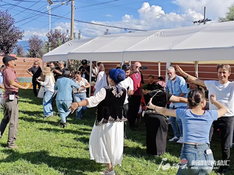 土耳其媒體人士在新源縣那拉提鎮(zhèn)英加爾村與村民同跳新疆舞。石榴云/新疆日報記者 宋海波攝