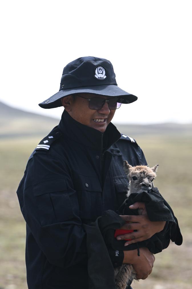 7月8日下午,巡山隊(duì)員正在對可可西里腹地卓乃湖區(qū)域開展巡護(hù)。突然,對講機(jī)傳來了青海省公安廳森林警察總隊(duì)五級輔警多結(jié)仁欠的聲音:“我發(fā)現(xiàn)了一只剛出生不久的藏羚羊,它的周圍沒有其他藏羚羊。”