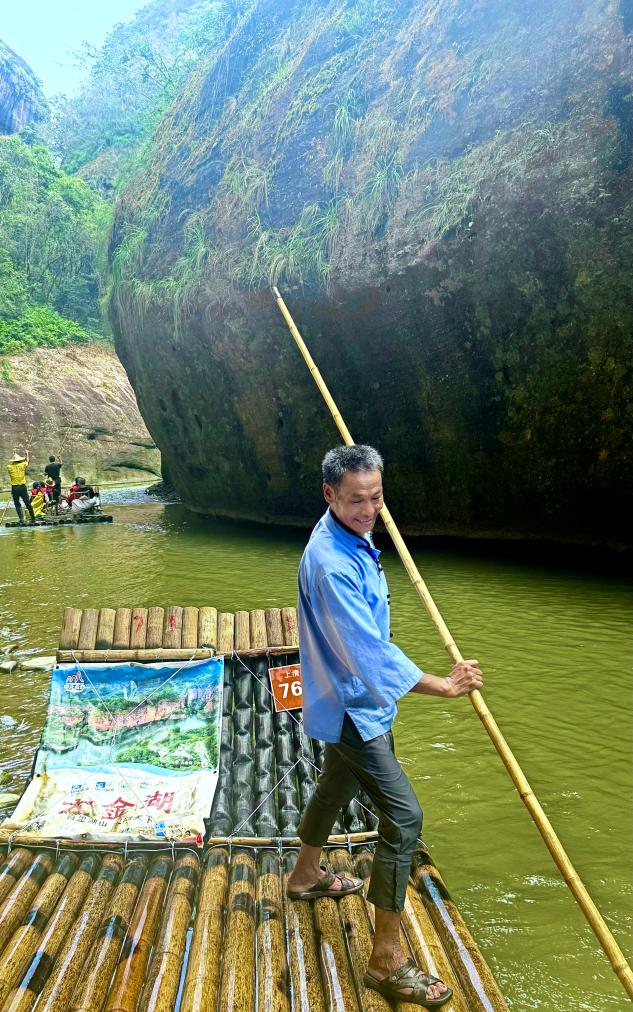 “我們一趟就要撐萬把下竹竿,一年下來要撐三百多萬下?!备闪?5年的上清溪排工黃盛騰談起他的排工生活,幽默風(fēng)趣,“上清溪全長16.5公里,落差比較大,排走得比較緩慢一些,那就比較吃力一些,所以說我們的工人叫‘吃飽了撐著’。”