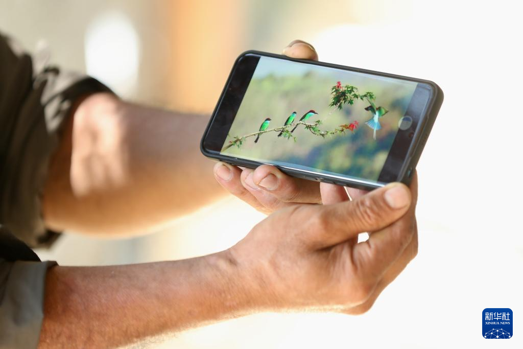 8月12日,福建南平市延平區(qū)爐下鎮(zhèn)斜溪村村民王崇年展示手機(jī)里攝影愛好者發(fā)來的藍(lán)喉蜂虎照片。 新華社記者 姜克紅 攝