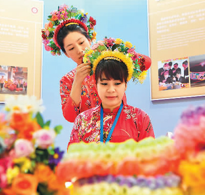 2月2日,兩名女孩在2024中國—東盟人文交流年展覽活動(dòng)上展示福建蟳埔女頭飾。新華社記者 姜克紅攝