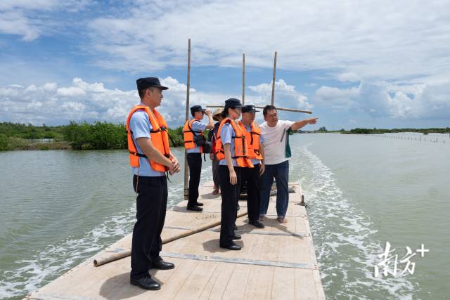 正是開工的好時候。4人熟練地登上舢板,沿著海岸線劃行,駛往保護區(qū)深處一個養(yǎng)殖塘。他們不時站到船頭,仔細打量岸邊的紅樹林,不斷向魚塘主老黃問話。