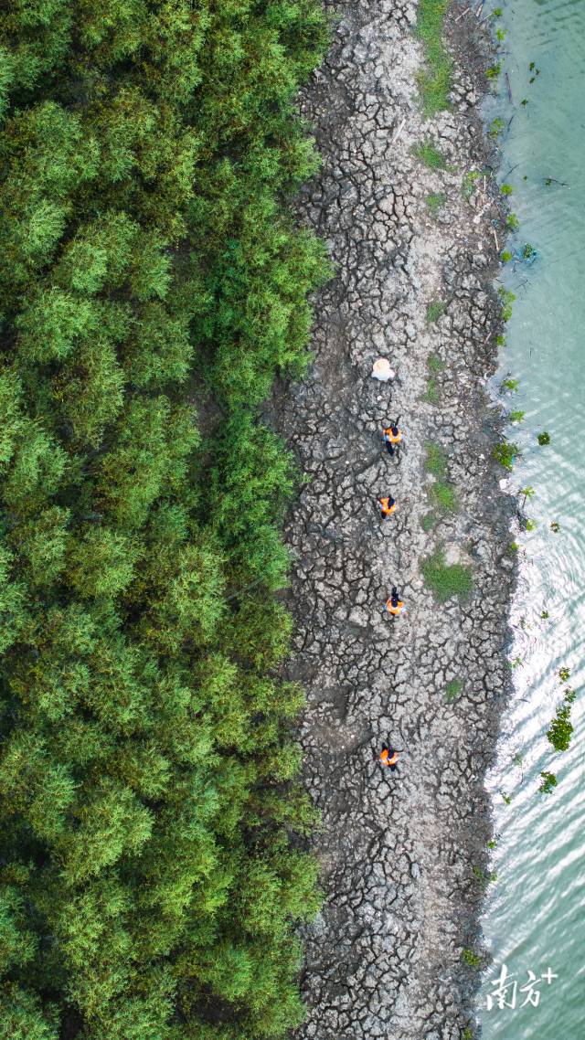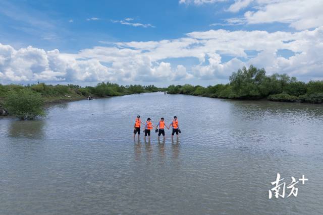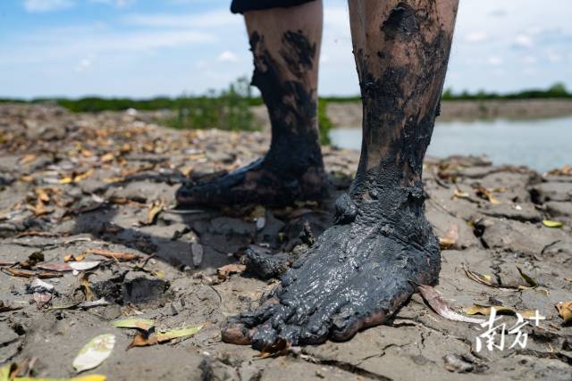 1個多月過去,補種的“樹寶寶”該做“體檢”了。日頭漸猛,潮漲起來了。“脫鞋蹚過去!”聽著楊健宏的招呼,大家一腳踏進泥地,一步一個腳印,泥土很快爬滿了小腿。