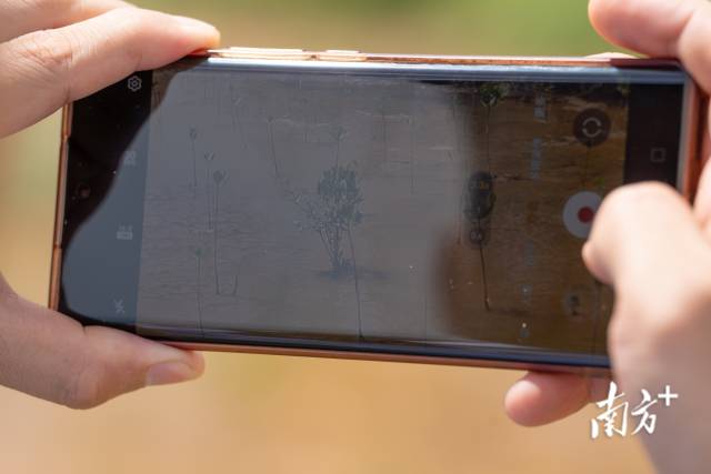 李明霖用手機拍下剛復(fù)種不久的“樹寶寶”。通過不同時間的影像對比,他們可以監(jiān)測紅樹林總體長勢。