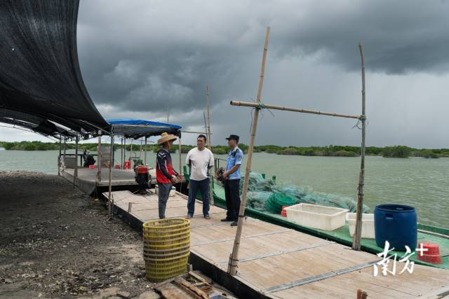 暴雨前夕,楊健宏正與保護區(qū)管理局工作人員向魚塘主科普紅樹林保護知識。