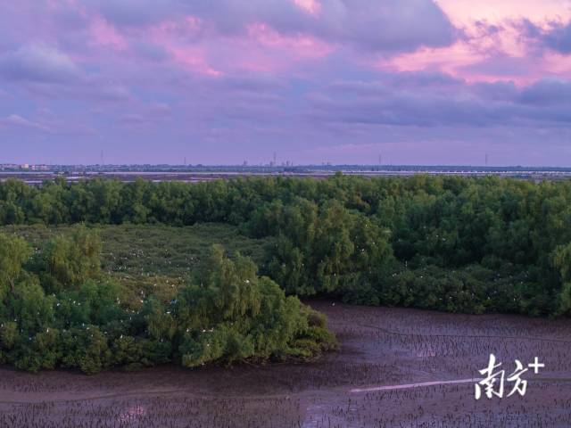 傍晚,晚霞鋪滿天空,一群群鷺鳥飛回紅樹林過夜。