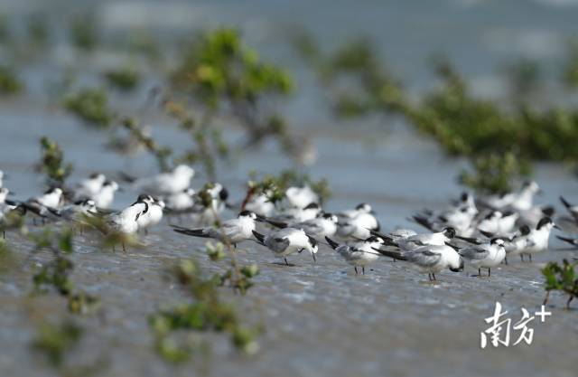成群的小鳥在紅樹林覓食。