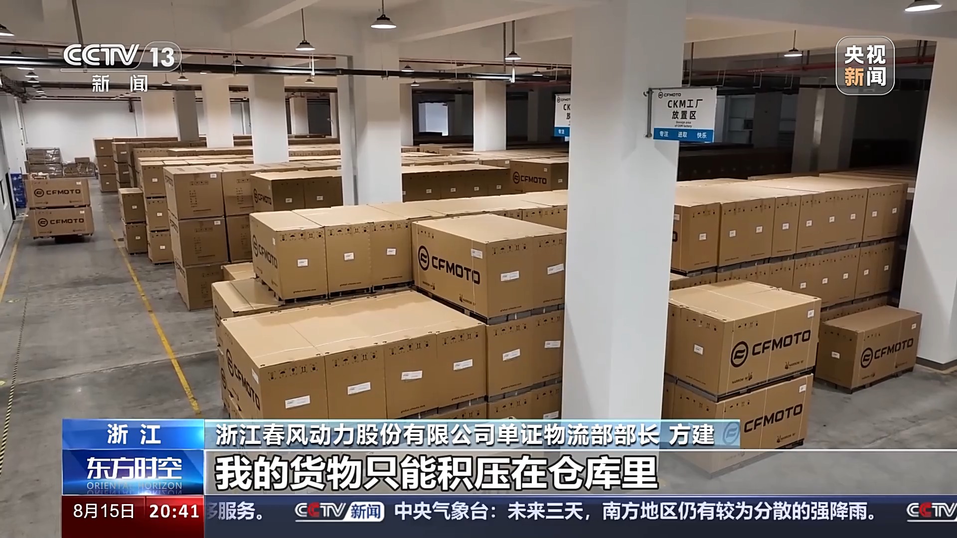 浙江春風(fēng)動力股份有限公司單證物流部部長 方建:因為外貿(mào)訂單是在手的,然后生產(chǎn)線也是不停的。如果說貨物出口沒有集裝箱的話,我的貨物只能積壓在倉庫里。