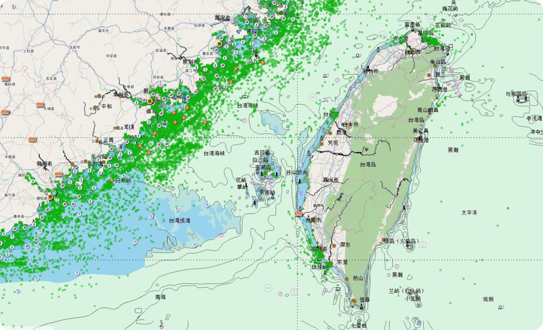 ||臺(tái)灣海峽航行船舶實(shí)時(shí)分布情況(綠點(diǎn)代表正在臺(tái)灣海峽航行的船只)