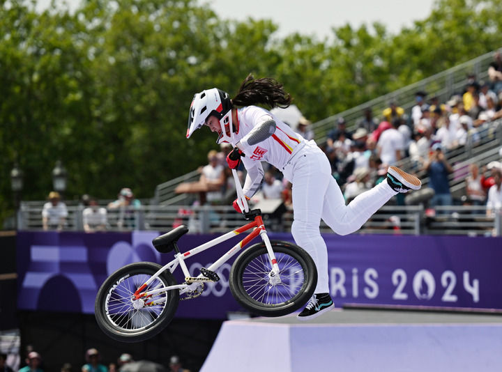 中國選手鄧雅文在巴黎奧運(yùn)會(huì)自由式小輪車女子公園賽決賽中獲得冠軍(2024年7月31日攝)。新華社記者 胡虎虎 攝