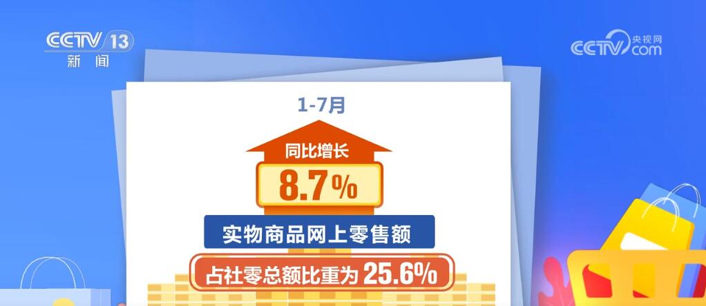 同時,線上消費增勢較好。1—7月,實物商品網上零售額同比增長8.7%,占社零總額比重為25.6%。7月份,我國快遞業(yè)務量達142.6億件,同比增長22.2%。